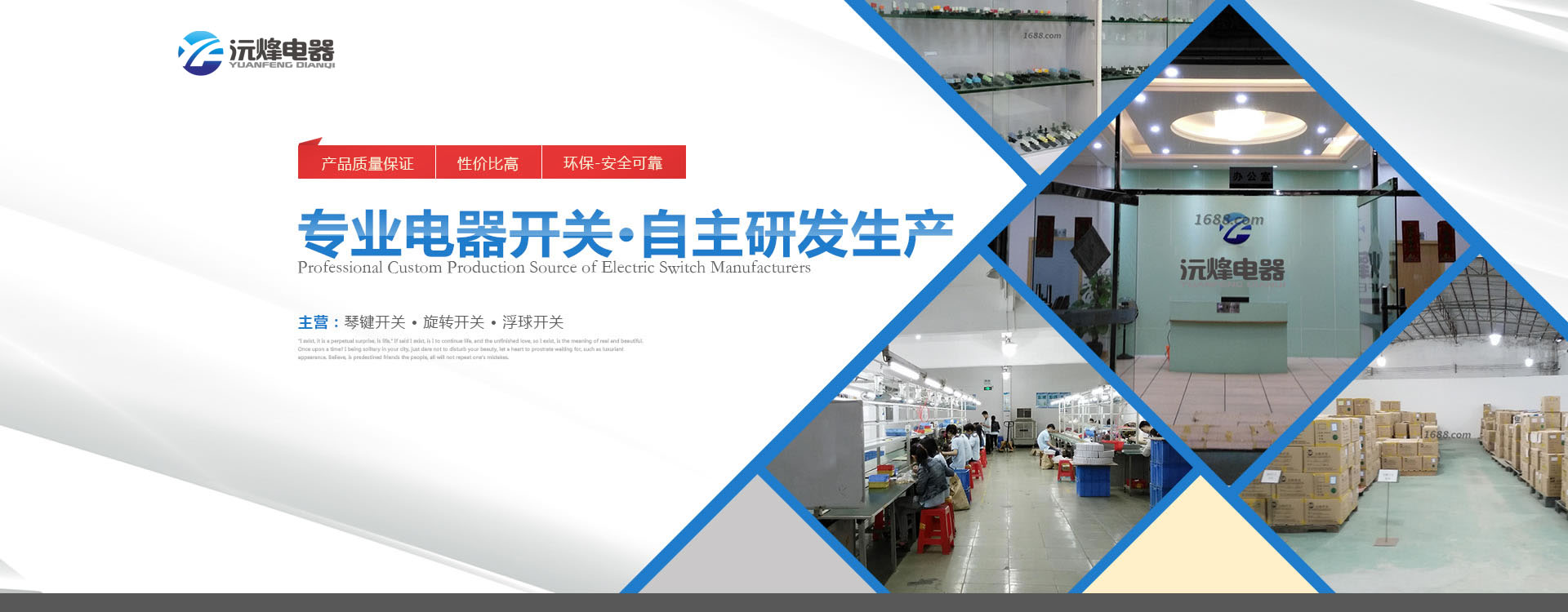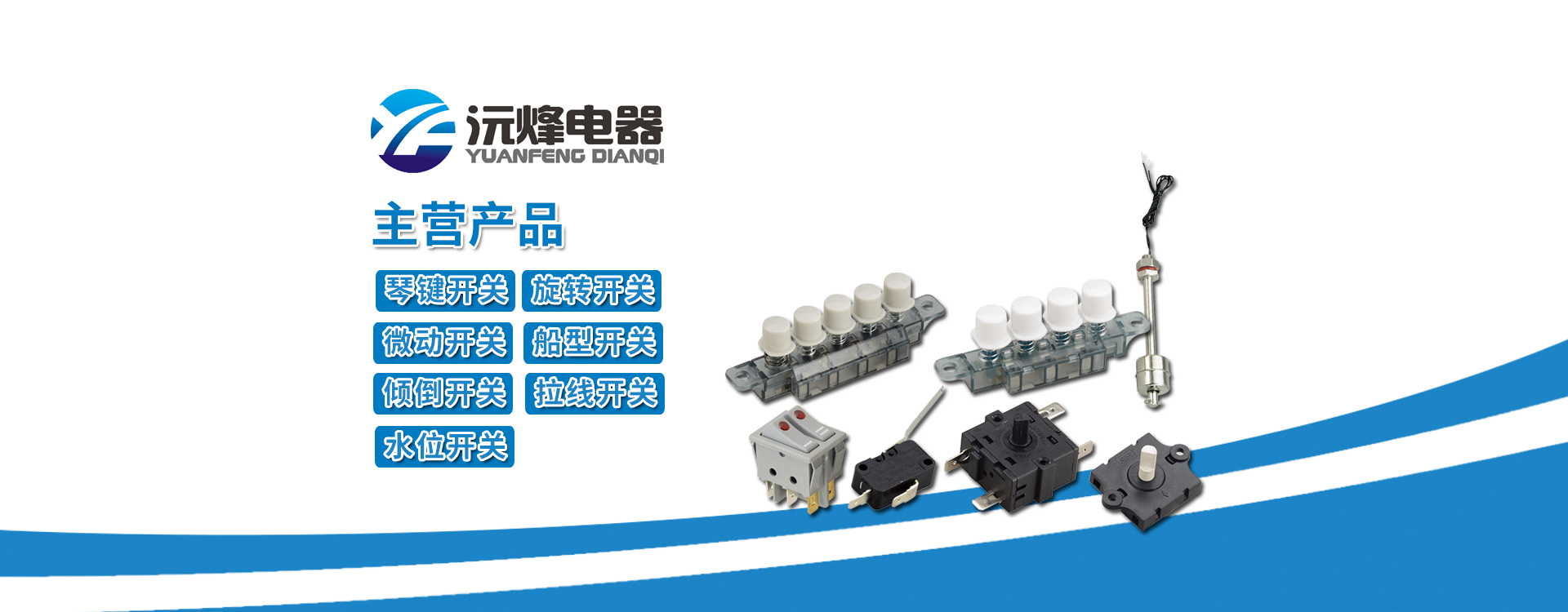 主要生產(chǎn)浮球開關(guān)、接近開關(guān)、琴鍵開關(guān)、旋轉(zhuǎn)開關(guān)、微動(dòng)開關(guān)、船型開關(guān)、拉線開關(guān)以及接線座等系列產(chǎn)品。 -